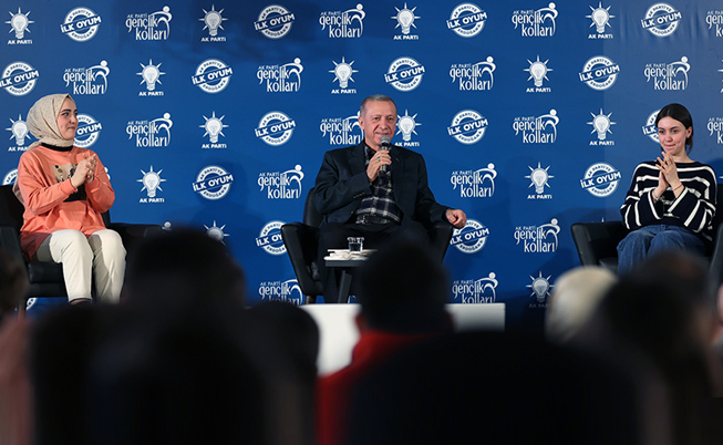 Erdoğan, ilk defa oy kullanacak gençlerle ilgili olarak, "Bugün önümüzdeki seçimlerde ilk defa oy kullanacak siz gençlerimizden beklentimiz elinizin altındaki imkanlarla dünyayı ve ülkemizi en iyi, en doğru şekilde okumanızdır. Maziden atiye sağlam bir köprü kurmadan, bu okumayı güçlü bir şekilde yapmadan, nerede bulunduğumuzu özellikle nereye gideceğimizi de bilemeyiz. Biz her konuda olduğu gibi, bu hususta da siz gençlerimize güveniyoruz. Birileri gibi gençlerimizi iradesi ipotek altında tutulacak vitrin süsü, konu mankeni olarak asla görmedik, görmüyoruz." diye konuştu.