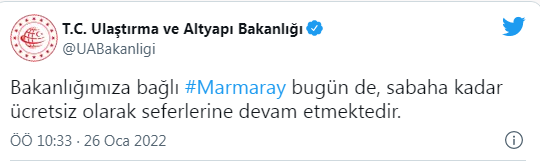 Ulaştırma Bakanı Adil Karaismailoğlu yaptığı açıklamada, "Bakanlığımıza bağlı Marmaray'da bugün de seferler İstanbullu vatandaşlarımıza ücretsiz hizmet verecek" dedi.