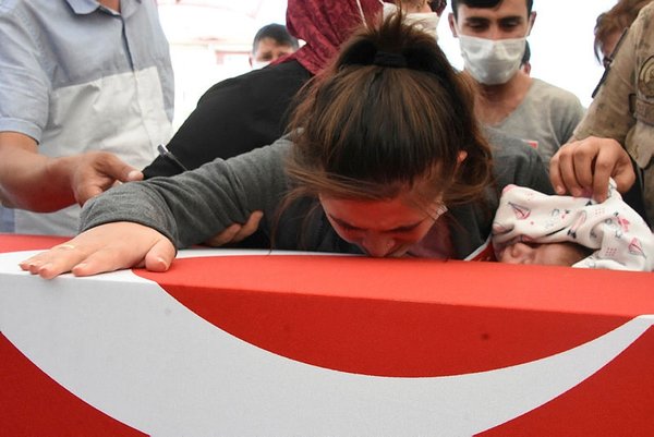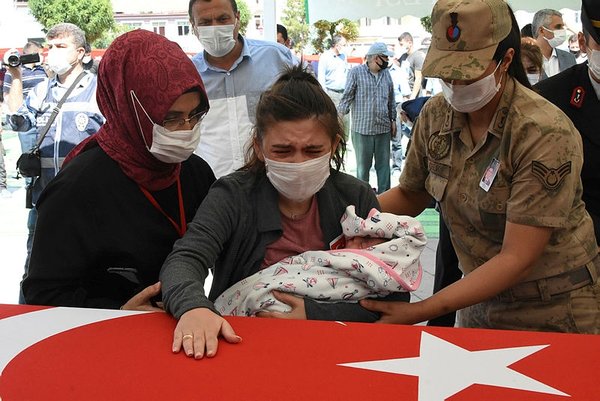 Şehidimizin bir yıllık eşi Gül Aktay, 20 günlük bebeği Göktürk Efe ile birlikte cenaze törenine katılarak hem eşine veda etti, hem de oğluna babasının fotoğrafını gösterdi.