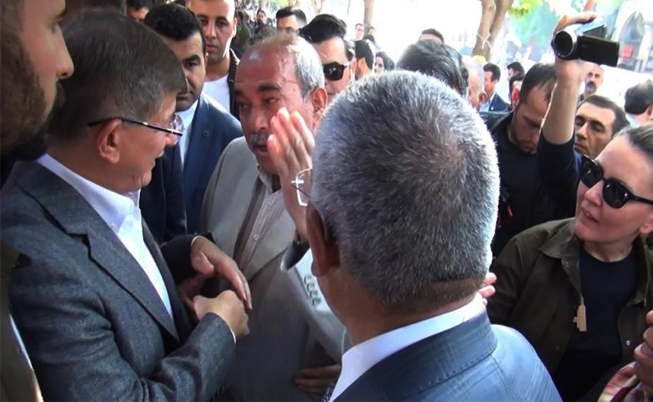 Şehit babasına cevap vermeyen Davutoğlu, esnafın olduğu bölgeden hızla ayrıldı.