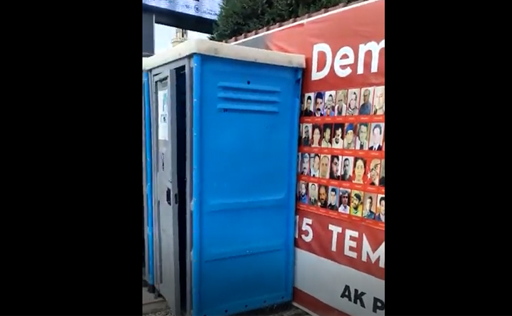 Sosyal medyada yayınlanan videoda, 15 Temmuz şehitlerinin fotoğraflarının olmasının yanı sıra mobil tuvaletin, Mustafa Kemal Atatürk'ün fotoğrafının tam önüne konulması akıllarda soru işareti oluşturdu.