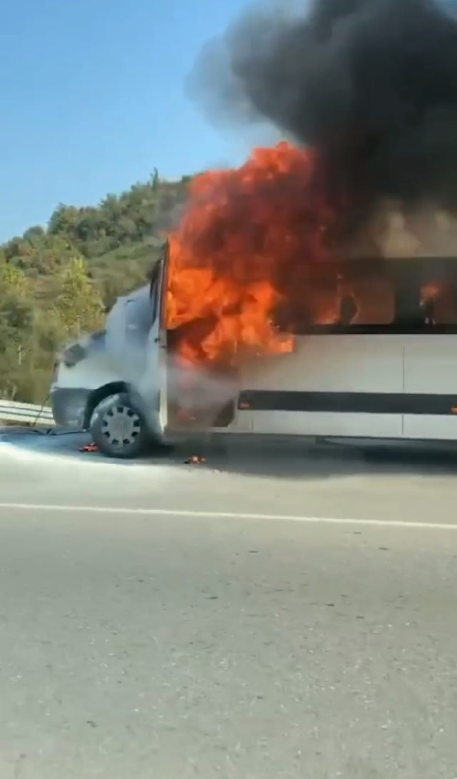 Edinilen bilgiye göre, Mudanya istikametine doğru ilerlediği sırada aldığı kokuyla araçtan inen servis minibüsü şoförü, aracı yolun sağına çekti. Minibüsün ön kısmından yükselen dumanların ardından araç bir anda alev topuna döndü. 3 şeritli yol kontrol amaçlı tek şeride indirilirken, yaşanan korku dolu anlar vatandaşların cep telefonu kamerasına yansıdı.