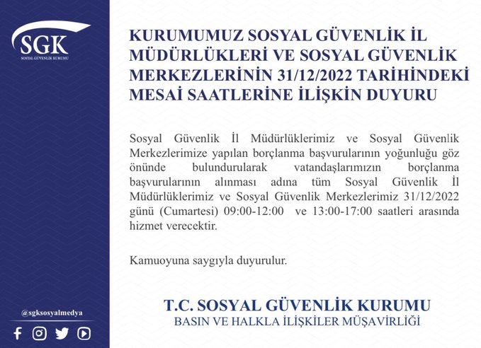 Borçlanma başvurularınız için 31 Aralık 2022 Cumartesi günü tüm sosyal güvenlik il müdürlüklerimiz ve sosyal güvenlik merkezlerimiz hizmet vermeye devam edecektir.