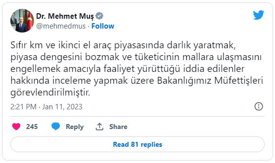 "Sıfır kilometre ve ikinci el araç piyasasında darlık yaratmak, piyasa dengesini bozmak ve tüketicinin mallara ulaşmasını engellemek amacıyla faaliyet yürüttüğü iddia edilenler hakkında inceleme yapmak üzere Bakanlığımız müfettişleri görevlendirilmiştir." değerlendirmesinde bulundu.