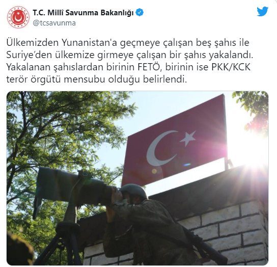 Milli Savunma Bakanlığı (MSB), "Ülkemizden Yunanistan'a geçmeye çalışan beş şahıs ile Suriye’den ülkemize girmeye çalışan bir şahıs yakalandı. Yakalanan şahıslardan birinin FETÖ, birinin ise PKK/KCK terör örgütü mensubu olduğu belirlendi." açıklamasında bulundu.