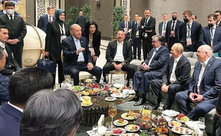 Ebedi Şehir Kompleksi ziyaretinde Rusya Devlet Başkanı Vladimir Putin ile ayak üstü sohbet eden Cumhurbaşkanı Erdoğan'ın gayrıresmi akşam yemeğinde bir araya gelen liderlerle verdiği samimi pozları da dikkat çekti.