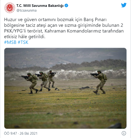 MSB'den yapılan açıklamada, "Huzur ve güven ortamını bozmak için Barış Pınarı bölgesine taciz ateşi açan ve sızma girişiminde bulunan 2 PKK/YPG’li terörist, Kahraman Komandolarımız tarafından etkisiz hâle getirildi." denildi.