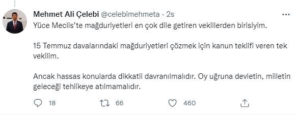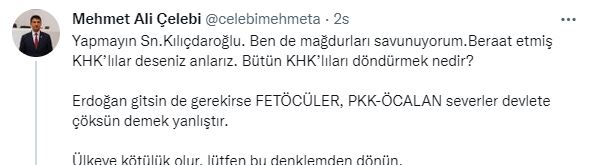 Kemal Kılıçdaroğlu'nun açıklamasına ise CHP'den istifa eden Bağımsız vekil Mehmet Ali Çelebi çok sert tepki gösterdi. Mehmet Ali Çelebi, "Yapmayın Sn.Kılıçdaroğlu. Ben de mağdurları savunuyorum.Beraat etmiş KHK'lılar deseniz anlarız. Bütün KHK'lıları döndürmek nedir? Erdoğan gitsin de gerekirse FETÖCÜLER, PKK-ÖCALAN severler devlete çöksün demek yanlıştır. Ülkeye kötülük olur, lütfen bu denklemden dönün." dedi.