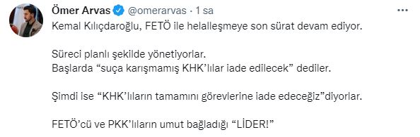 AK Parti Tanıtım ve Medya Başkan Yardımcısı Ömer Arvas da, "Kemal Kılıçdaroğlu, FETÖ ile helalleşmeye son sürat devam ediyor. Süreci planlı şekilde yönetiyorlar. Başlarda "suça karışmamış KHK'lılar iade edilecek" dediler. Şimdi ise "KHK'lıların tamamını görevlerine iade edeceğiz"diyorlar. FETÖ'cü ve PKK'lıların umut bağladığı "LİDER!"" sözleriyle Kılıçdaroğlu'nun açıklamalarına tepki gösterdi.
