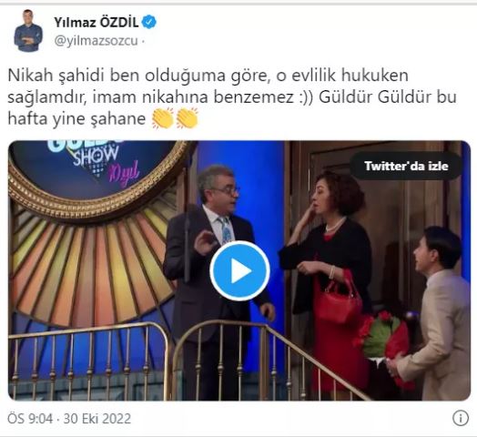 Skeçte geçen "Yeni Atatürk kitabımı yazdıktan sonra sendeyim" gafını anlamayan Özdil, olayı nikah şahitliğine çevirdi. "Nikah şahidi ben olduğuma göre, o evlilik hukuken sağlamdır, imam nikahına benzemez :))" açıklamasını yapan Özdil, bu açıklamayla da tepki çekti.