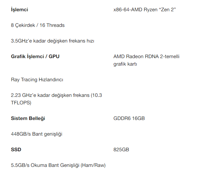 Yüksek donanıma sahip olan oyun konsolu, özel üretim entegre CPU ve GPU mimarisi sayesinde oyunculara 4K kalitesinde oyun deneyimi yaşatıyor, ayrıca oyun konsolunda bulunan I/O teknolojisine sahip ultra-yüksek hızlı SSD sayesinde oyuncular neredeyse hiç beklemeden oyuna başlıyor.
