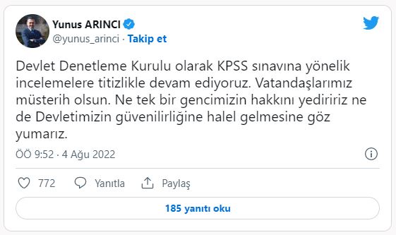 Devlet Denetleme Kurulu Başkanı Yunus Arıncı "Devlet Denetleme Kurulu olarak KPSS sınavına yönelik incelemelere titizlikle devam ediyoruz. Vatandaşlarımız müsterih olsun. Ne tek bir gencimizin hakkını yediririz ne de Devletimizin güvenilirliğine halel gelmesine göz yumarız" dedi.