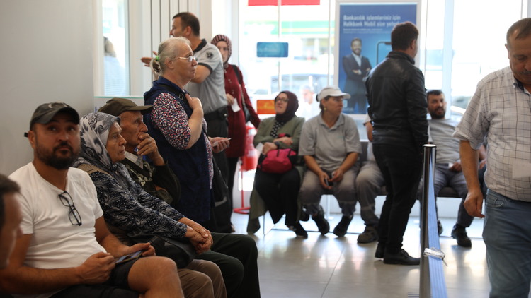 Başvuru yapmak isteyen vatandaşlar yoğunluk nedeniyle sırayla banka şubelerine alınıyor.