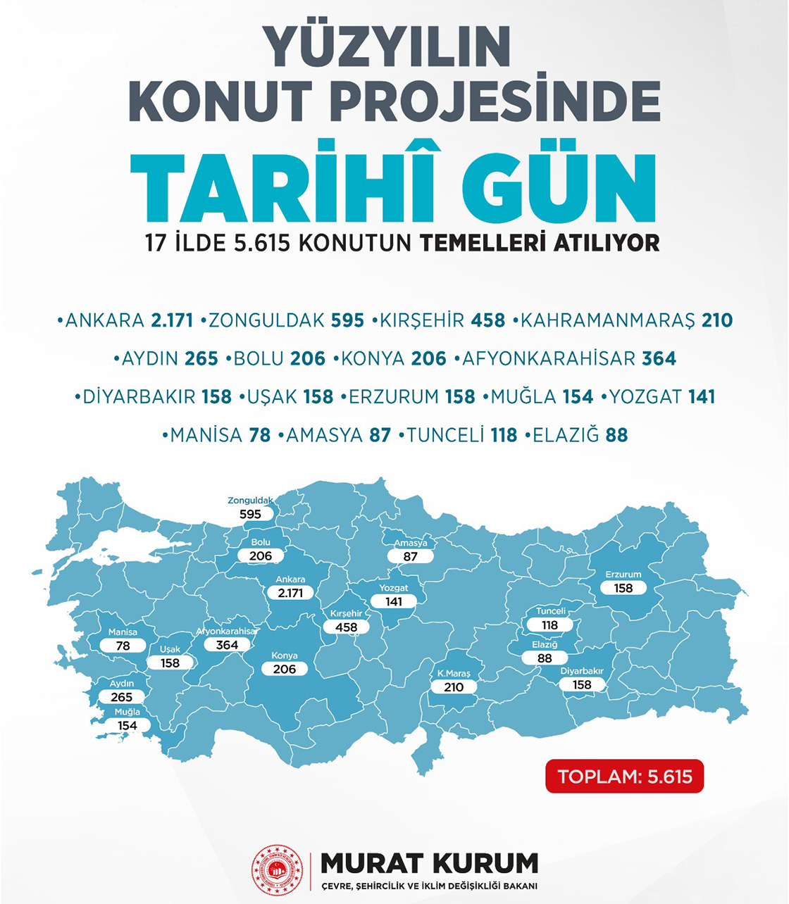 Ankara'da 2 bin 171, Zonguldak'ta 595, Kırşehir'de 458, Kahramanmaraş'ta 210, Aydın'da 265, Bolu'da 206, Konya'da 206, Afyonkarahisar'da 364, Diyarbakır'da 158, Uşak'ta 158, Erzurum'da 158, Muğla'da 154, Yozgat'ta 141, Manisa'da 78, Amasya'da 87, Tunceli'de 118 ve Elazığ'da 88 konutun temeli atılacak.