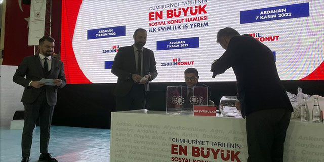 Ardahan'ın İnönü Mahallesi'ndeki Kazım Karabekir Spor Salonu'nda düzenlenen kura törenine, Vali Vekili Şahin Demir, Çevre, Şehircilik ve İklim Değişikliği İl Müdürü Bahtiyar Topal ile konutlara başvuru yapan aileler katıldı.