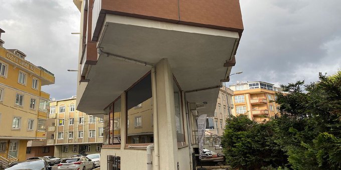 Bir kısmı, üçgen şeklinde inşa edilen apartmanın, sosyal medyada paylaşılan fotoğrafı 'depremde çökme riski' konusunda tartışma yarattı.