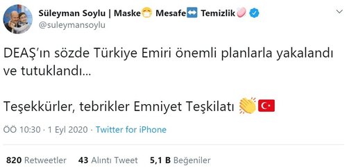 Soylu, "DEAŞ'ın sözde Türkiye Emiri önemli planlarla yakalandı ve tutuklandı...Teşekkürler, tebrikler Emniyet Teşkilatı" dedi.