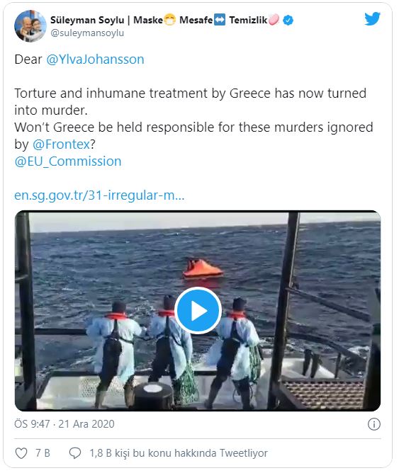 Ege'deki düzensiz göçmenlere yönelik olarak kötü muamelede bulunan Yunanistan unsurlarının görüntüleri ortaya çıktı. İçişleri Bakanı Süleyman Soylu, sosyal medya platformu Twitter üzerinden yaptığı paylaşımda bu görüntülere yer verdi ve AB İçişleri Komiseri Ylva Johansson'un hesabını etiketleyerek kendisine seslendi.