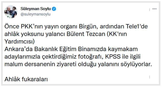Bu açıklamaların üzerine resmi Twitter hesabından bir paylaşım yapan Bakan Soylu, "Önce PKK’nın yayın organı Birgün, ardından Tele1'de ahlâk yoksunu yalancı Bülent Tezcan (KK'nın Yardımcısı) Ankara’da Bakanlık Eğitim Binamızda kaymakam adaylarımızla çektirdiğimiz fotoğrafı, KPSS ile ilgili malum dersanenin ziyareti olduğu yalanını söylüyorlar. Ahlâk fukaraları" ifadelerini kullandı.