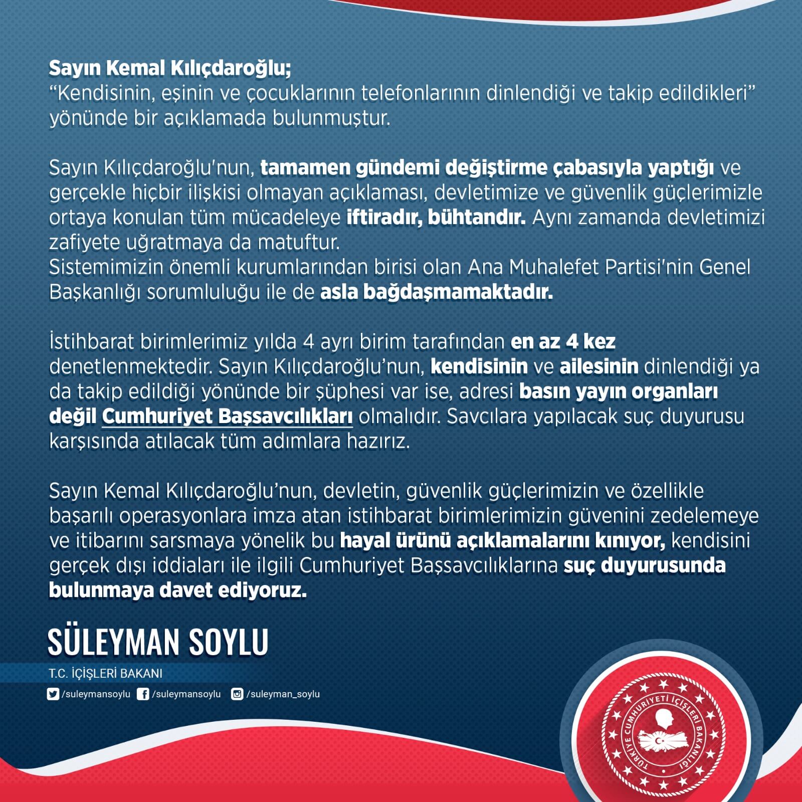 İçişleri Bakanı Süleyman Soylu, resmi Twitter hesabı üzerinden yazılı bir açıklamada bulunarak geçtiğimiz günlerde, CHP Lideri Kemal Kılıçdaroğlu tarafından ortaya atılan, "telefonunun dinlendiğine" ilişkin iddiaları yanıtladı.