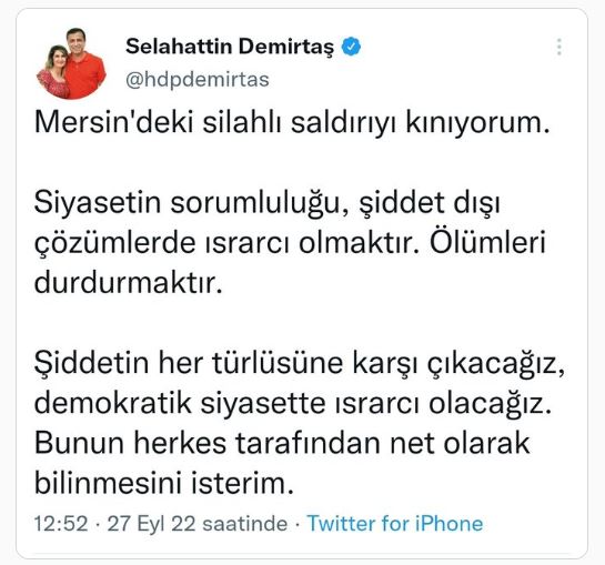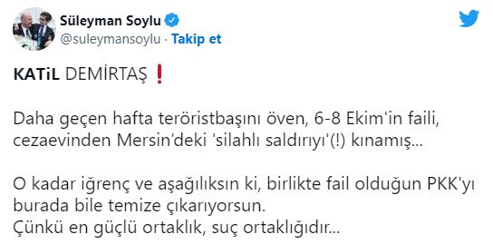 Bakan Soylu, "Daha geçen hafta teröristbaşını öven, 6-8 Ekim'in faili, cezaevinden Mersin’deki 'silahlı saldırıyı'(!) kınamış... O kadar iğrenç ve aşağılıksın ki, birlikte fail olduğun PKK'yı burada bile temize çıkarıyorsun. Çünkü en güçlü ortaklık, suç ortaklığıdır..." dedi.