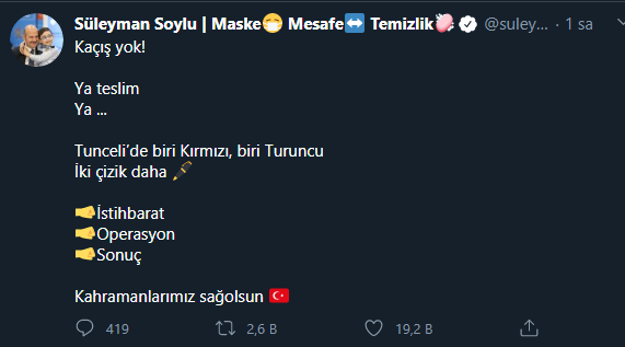 Sosyal medya platformu Twitter üzerinden gelişmeleri paylaşan İçişleri Bakanı Süleyman Soylu, "Kaçış yok, ya teslim, ya... Tunceli'de biri Kırmızı, biri Turuncu iki çizik daha. İstihbarat, operasyon, sonuç. Kahramanlarımız sağolsun." ifadeleriyle paylaşım yaptı.