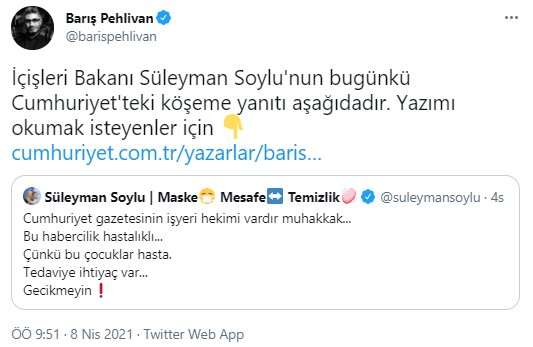 Bakan Soylu'nun tepkisinin ardından adeta yüzsüzlük yapan Barış Pehlivan, Soylu'nun kendisine gösterdiği tepkiyi alıntılayarak Konuyla ilgili Twitter hesabından açıklamada bulunan Soylu, “İçişleri Bakanı Süleyman Soylu'nun bugünkü Cumhuriyet'teki köşeme yanıtı aşağıdadır. Yazımı okumak isteyenler için" diyerek yazısının linkini paylaştı. Pehlivan, bu paylaşımıyla Bakan Soylu'nun tepkisini bile yazısı için tıklanmaya çevirmeye çalıştı.