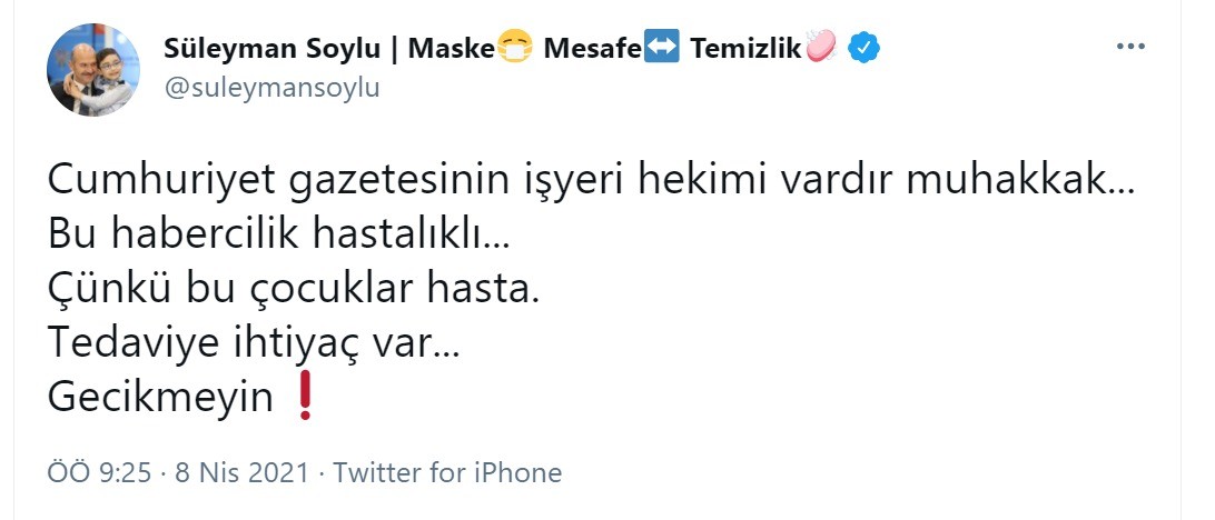 Konuyla ilgili Twitter hesabından açıklamada bulunan İçişleri Bakanı Süleyman Soylu, bir fotoğraf üzerinden yola çıkılarak kaleme alınan bu yazıya tepki göstererek “Bu habercilik hastalıklı. Çünkü bu çocuklar hasta. Tedaviye ihtiyaç var. Gecikmeyin” ifadelerini kullandı.