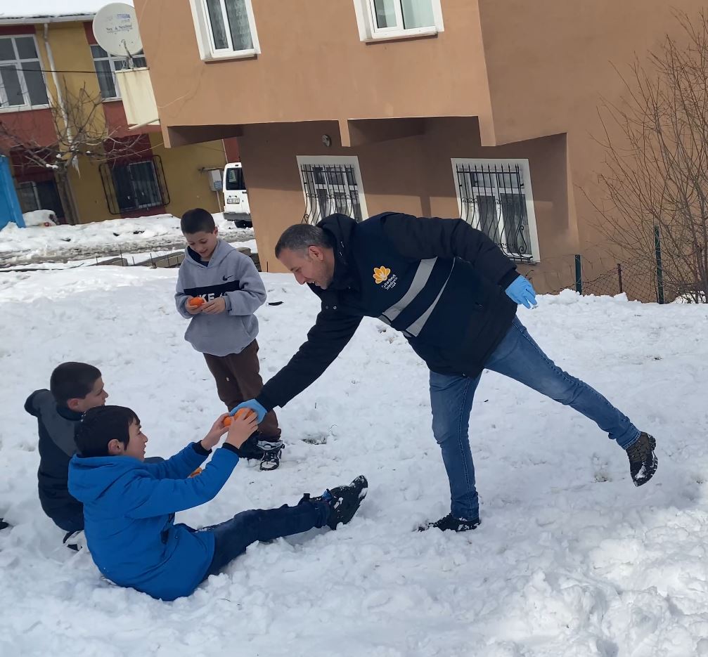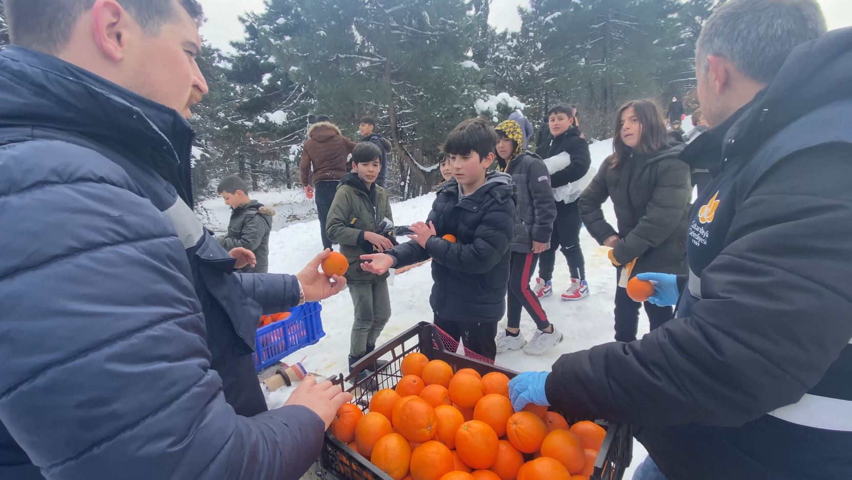 Soğuk kış günlerinde sağlıklı beslenmeye dikkat çekmek için kartopu oynayan ve kızak kayan çocuklara c vitamini takviyesi için portakal ve mandalina ikram edildi. Öte yandan belediye ekipleri, çocuklarla birlikte kartopu oynadı, kızak kaydı.