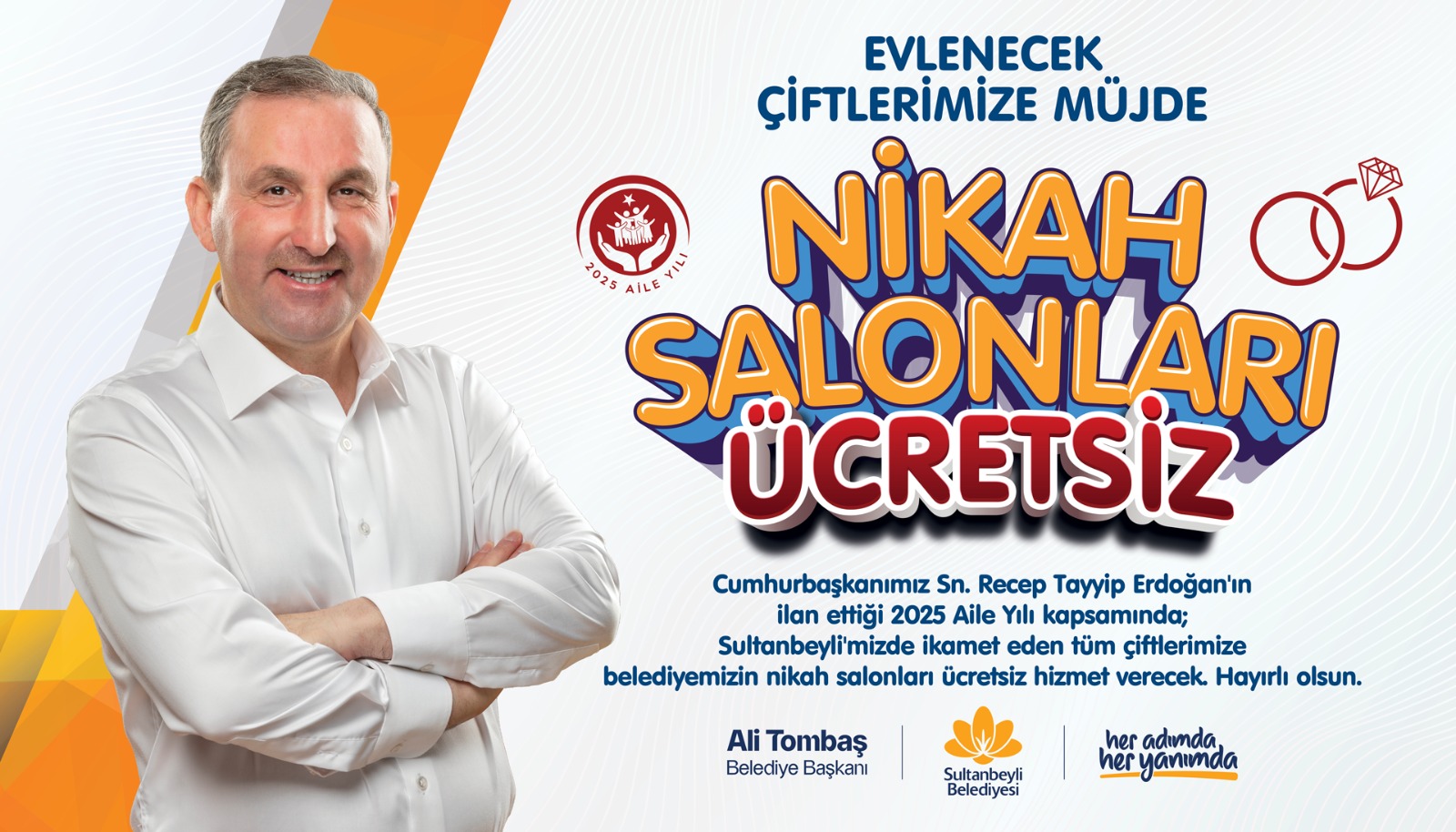 Sultanbeyli Belediye Başkanı Ali Tombaş’tan evlenecek çiftlere müjde. Başkan Tombaş, Cumhurbaşkanı Recep Tayyip Erdoğan tarafından ilan edilen 2025 Aile Yılı kapsamında, belediyeye bağlı nikah salonlarının ücretsiz hizmet vereceğini duyurdu.
