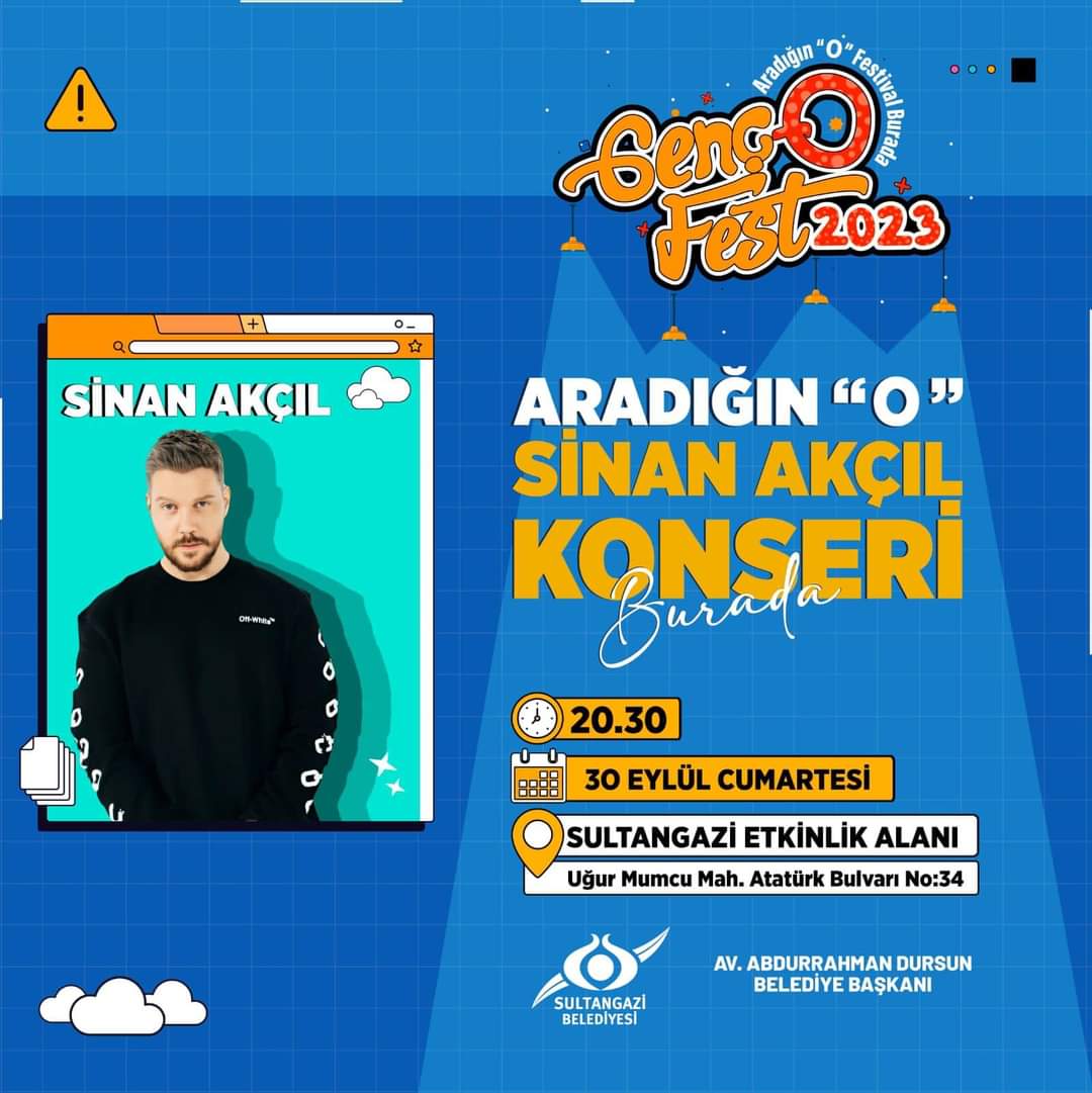 Türkiye’nin en popüler sanatçılarından, gençliğin ve milyonların sevdiği sanatçı Sinan Akçıl, Sultangazi Belediye Başkanı Av. Abdurrahman Dursun’un ev sahipliğinde Sultangazi etkinlik alanında 30 Eylül Cumartesi günü saat 20.30’da gerçekleşecek tarihi konsere herkes tanıklık edecek, çok yoğun katılım beklenen bu tarihi konser Sultangazi gençlerinin ve halkının mutlulukları adına güzel ve derin bir iz bırakacak.