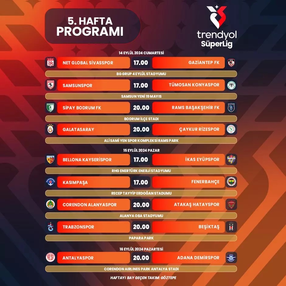 Süper Lig'in 6. haftasındaki Fenerbahçe-Galatasaray derbisi ise 21 Eylül Cumartesi günü 20.00'de başlayacak.