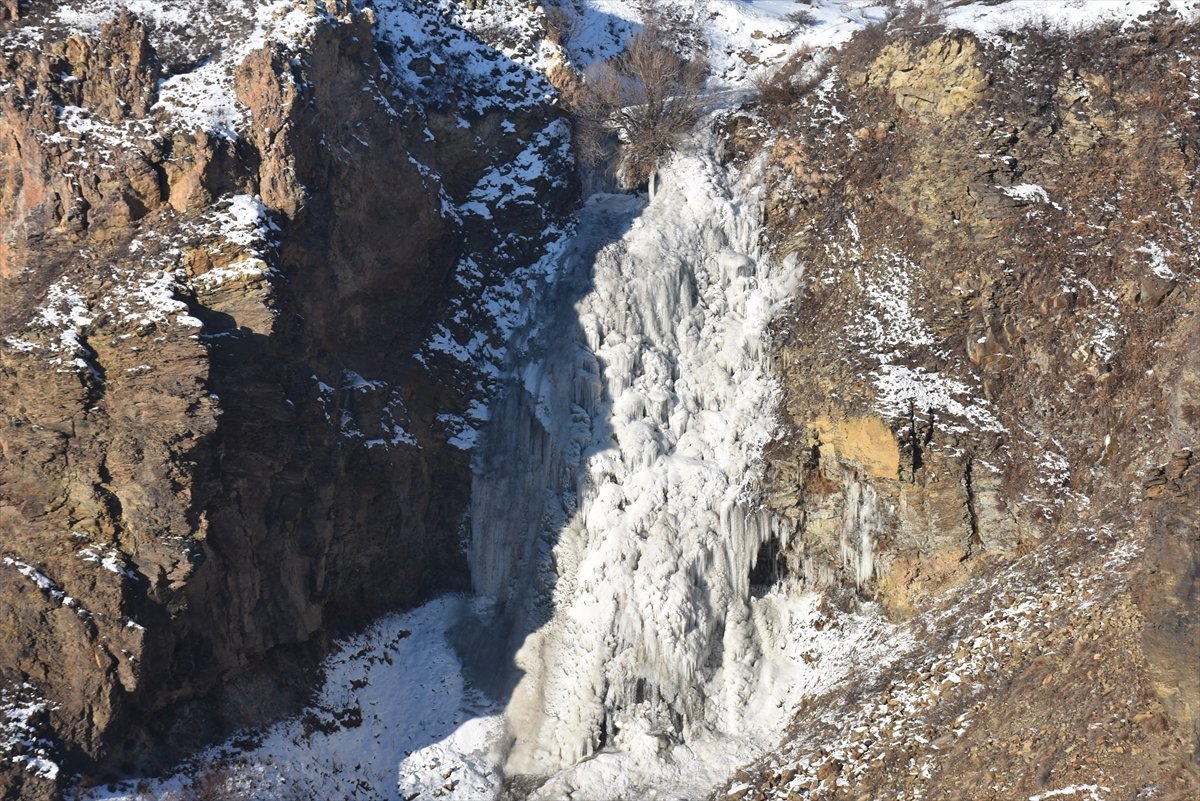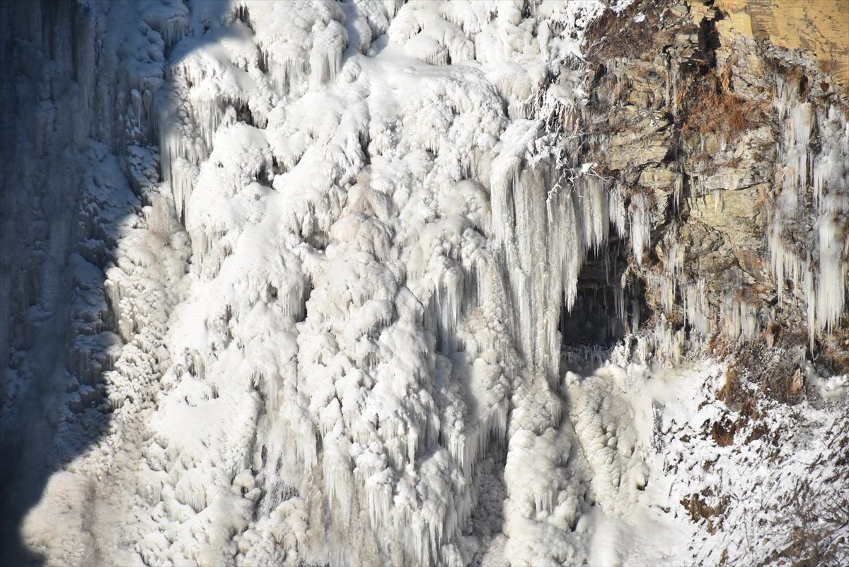 Bölge halkının "Su uçan" olarak adlandırdığı şelalenin buzla kaplanan görüntüsü, seyrine doyum olmayan manzara oluşturdu.