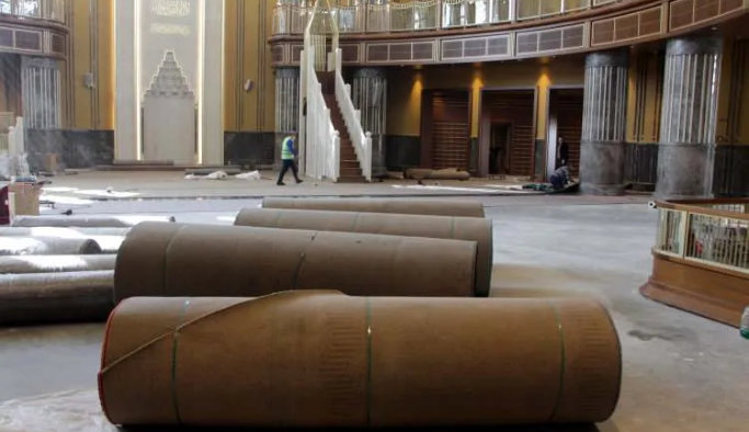 Taksim'de yapılan camide son adıma gelindi. Ramazan ayının son Cuma günü açılması planlanan caminin deve tüyü rengi halıları serilmeye başlandı.
