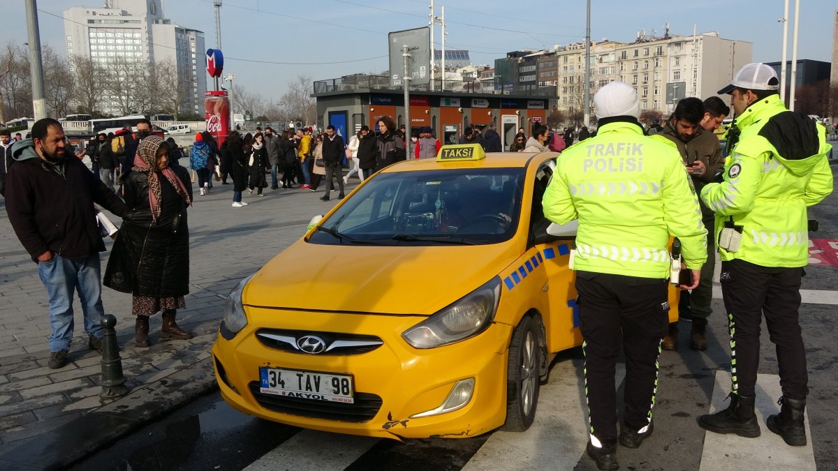 İstanbul Emniyet Müdürlüğü’ne bağlı trafik polisleri, Taksim Meydanı’nda kurdukları kontrol noktasında ticari taksilere yönelik denetim gerçekleştirdi.