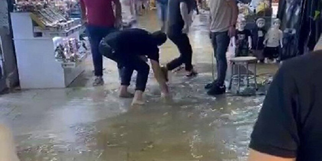 Dükkanına su girmemesi için vatandaşlar yoğun çaba sarfetti. Esnafın bazı ürünleri su altında kaldı.