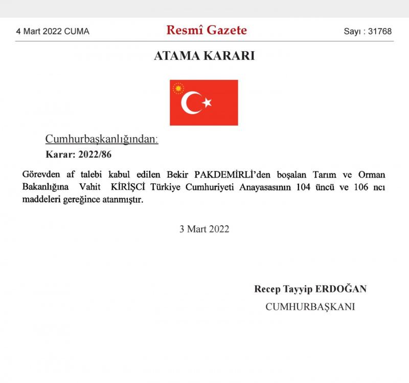 Buna göre, görevden affını isteyen ve bu talebi kabul edilen Bekir Pakdemirli'den boşalan Tarım ve Orman Bakanlığına Vahit Kirişci getirildi.