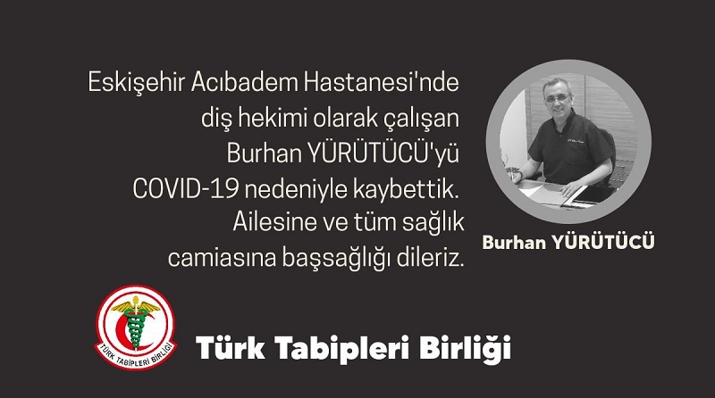 Koronavirüse yakalanan sağlık çalışanlarından biri de Eskişehir Acıbadem Hastanesi'nde çalışan Diş Doktoru Burhan Yürütücü idi. Burhan Yürütücü, koronavirüse yakalanarak tedavi sürecine alındı. Bir süredir koronavirüs tedavisi gören Yürütücü, virüse yenik düşerek yaşamını yitirdi.