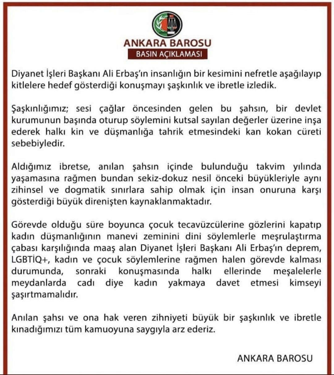 Ankara Barosu, “sesi çağlar öncesinden gelen bu şahıs”, “zihinsel ve dogmatik sınırlara sahip” diyerek İslam düşmanlığı yaptı.