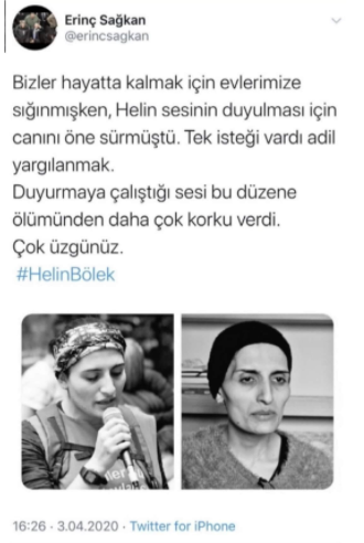 Mesajında "Bizler hayatta kalmak için evlerimize sığınmışken, Helin sesinin duyulması için canını öne sürmüştü. Tek isteği vardı adil yargılanmak" diyen Sağkan, "Duyurmaya çalıştığı sesi bu düzene ölümünden daha çok korku verdi. Çok üzgünüz" ifadelerini kullanmıştı.
