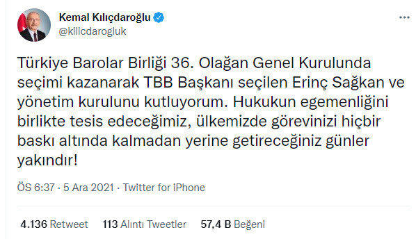 Türkiye Barolar Birliği (TBB) Başkanlığına, 348 delegeden 182'sinin oyunu alan Ankara Barosu Başkanı Ramiz Erinç Sağkan seçildi. Sağkan, seçilmesi sonrası geçmişte yaptığı paylaşımları ve Ankara Barosu başkanıyken İslam dinini hedef alan bildirisi nedeniyle yeniden gündeme geldi.