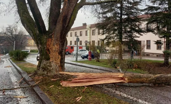 Yıldırım, ağaçtan büyük bir parçanın kopmasına neden olurken yakında bulunan bir araç, ağaçtan kopan parça sonucunda zarar gördü.