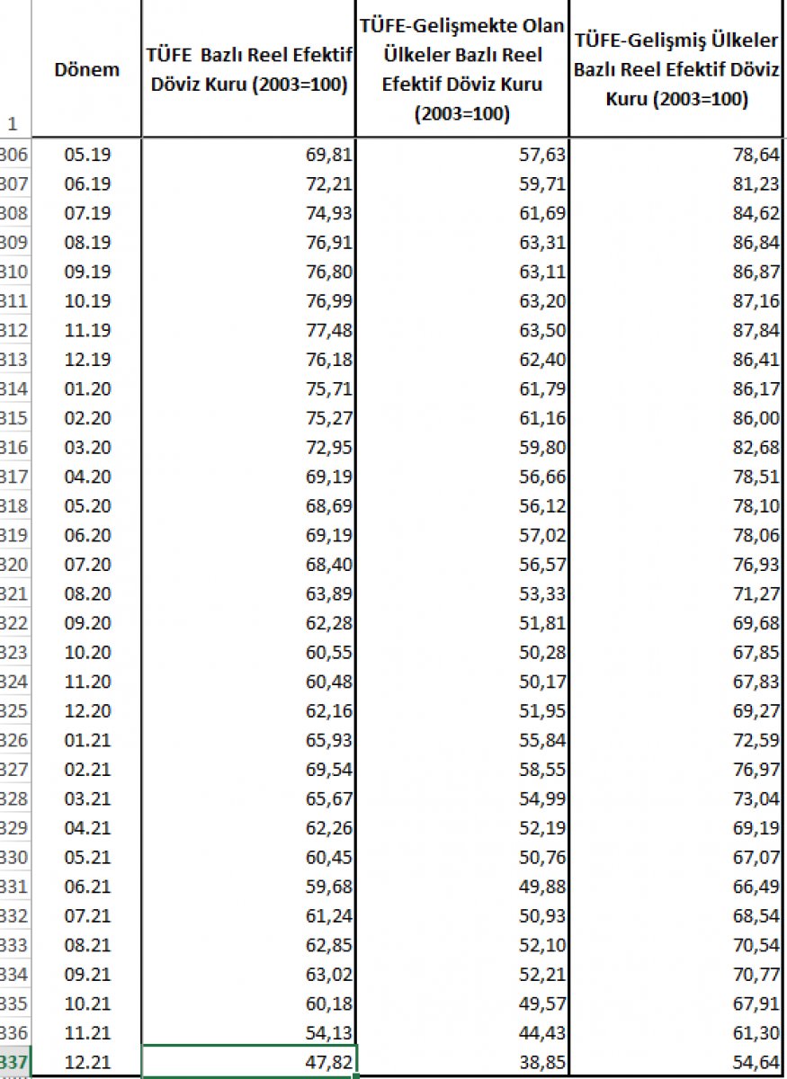 Kasım ayında TÜFE bazlı reel efektif döviz kuru 54,33 seviyesineydi. Merkez Bankası, aralık ayında TÜFE bazlı reel efektif döviz kurunun 47,82 seviyesine gerilediğini duyurdu.