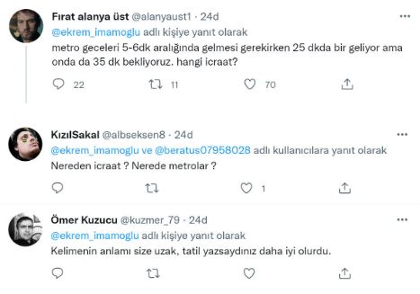 Vatandaşlar, Ekrem İmamoğlu'nun bu paylaşımına 'tatil' notuyla yanıt verdi. Metro seferlerinden, İETT otobüslerine kadar pek çok yerine getirilmeyen vaad İmamoğlu'na hatırlatıldı.