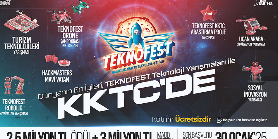 TEKNOFEST 2025 kapsamında Kuzey Kıbrıs Türk Cumhuriyeti’nde 7 ana kategori ve 14 alt kategoride düzenlenecek yarışmalar, teknolojinin farklı alanlarında yenilikçi çözümler geliştirme fırsatı sunacak. Dünyanın dört bir yanından teknoloji tutkunlarını buluşturacak TEKNOFEST KKTC Teknoloji Yarışmaları için başvuru süresi 30 Ocak tarihinde sona eriyor. Katılımın ücretsiz olduğu etkinliğe dair detaylı bilgi ve başvuru için www.teknofest.org adresin i ziyaret edebilirsiniz. Teknolojiyi bir adım ileriye taşımak ve projelerinizi dünyaya tanıtmak için bu fırsatı kaçırmayın!