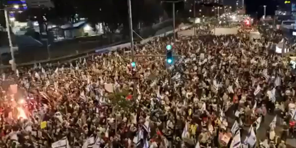 Hükümetin istifası ve erken seçim için sloganlar atan binlerce kişi kortej halinde, güvenlik güçlerinin her yönü demir bariyerler ve otobüslerle kapattığı Menachem Begin Caddesi'ne doğru düdükler ve ıslıklar çalarak yürüdü.