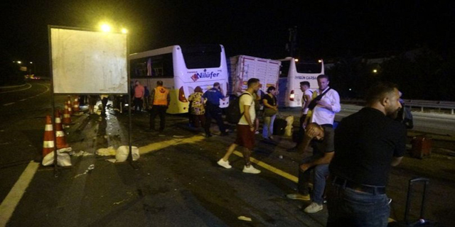 Savrulan kamyon, yan şeritten Ankara’dan Edirne’ye seyir halinde olan 16 ABE 799 plakalı yolcu otobüsüne çarptı. Çarpmanın etkisiyle kamyon ve otobüs, yol kenarındaki bariyeri devirerek yolun Ankara istikameti tarafında durabildi.