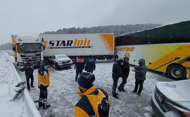 Daha sonra arkasından gelen 3 otomobil, 1 TIR ve 1 yolcu otobüsü de kazaya karıştı.