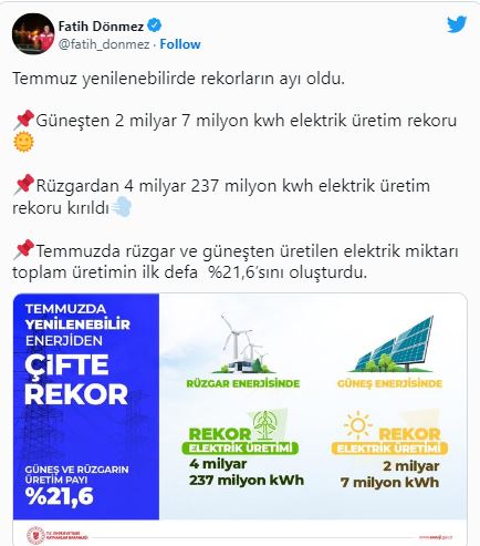 "Temmuz, yenilenebilirde rekorların ayı oldu. Güneşten 2 milyar 7 milyon kilovatsaat elektrik üretim rekoru, rüzgardan 4 milyar 237 milyon kilovatsaat elektrik üretim rekoru kırıldı. Temmuzda rüzgar ve güneşten üretilen elektrik miktarı toplam üretimin ilk defa yüzde 21,6’sını oluşturdu."