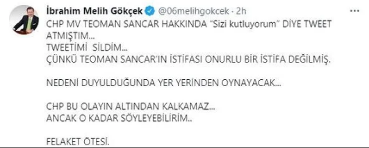 Sancar’ın, partisinden istifa etmesi üzerine sosyal medya adresinden ‘alkış’ ikonuyla birlikte ‘kutluyorum’ diye tweet atan eski Ankara Büyükeşhir Belediye Başkanı Melih Gökçek daha sonra “Tweetimi sildim. Onurlu bir istifa değilmiş... Felaket ötesi...” diye paylaşımda bulunmuştu.